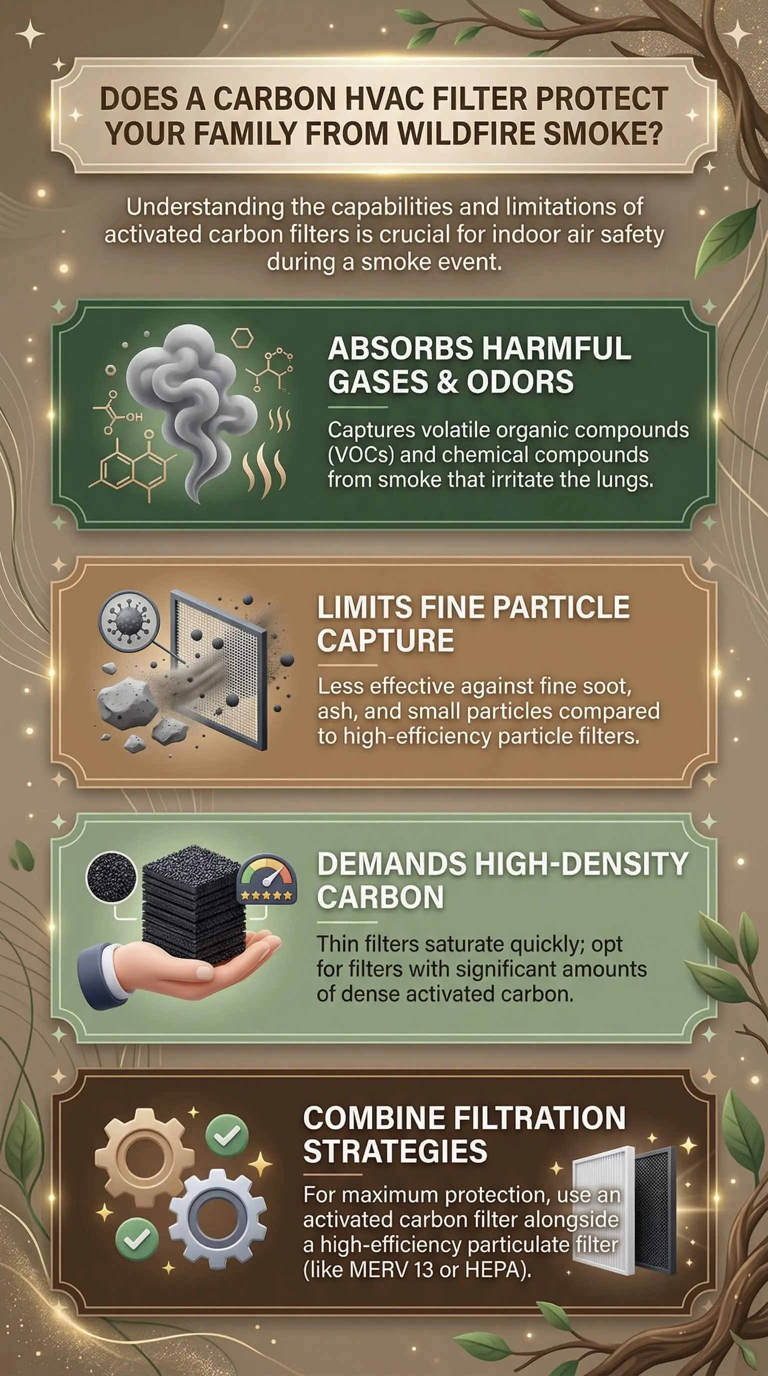 Here is the honest summary: a carbon HVAC filter does its job exceptionally well. It neutralizes gases, VOCs, and the acrid odors that make wildfire smoke immediately unpleasant indoors. The problem is not that carbon filtration doesn't work. The problem is that wildfire smoke is a two-part threat — and a carbon-only filter is a one-part answer.